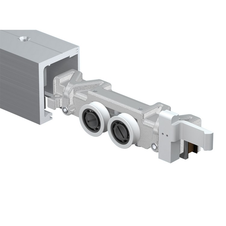 Mit nur zwei wartungsfreien Klemm-Laufwagen können Glaselemente bis zu 150 kg bewegt werden. Dies wird durch eine spezielle Rollentechnik gewährleistet, die sich auch bei Anwendungen mit Horizontal-Schiebewänden (HSW) seit Jahren bewährt hat. Bezüglich der Leichtläufigkeit erfüllt AGILE nach DIN EN 1527 die Kriterien der Klasse 3 – das bedeutet, dass maximal 4% der Türmasse als Anfangsreibung bewältigt DORMA AGILE 150/ AGILE 150 Syncro Kleinste Abmessungen – bestens genutzt werden müssen, um die Tür in Bewegung zu bringen. Somit ist gewährleistet, dass auch große Türen ohne besonderen Kraftaufwand betätigt werden können.